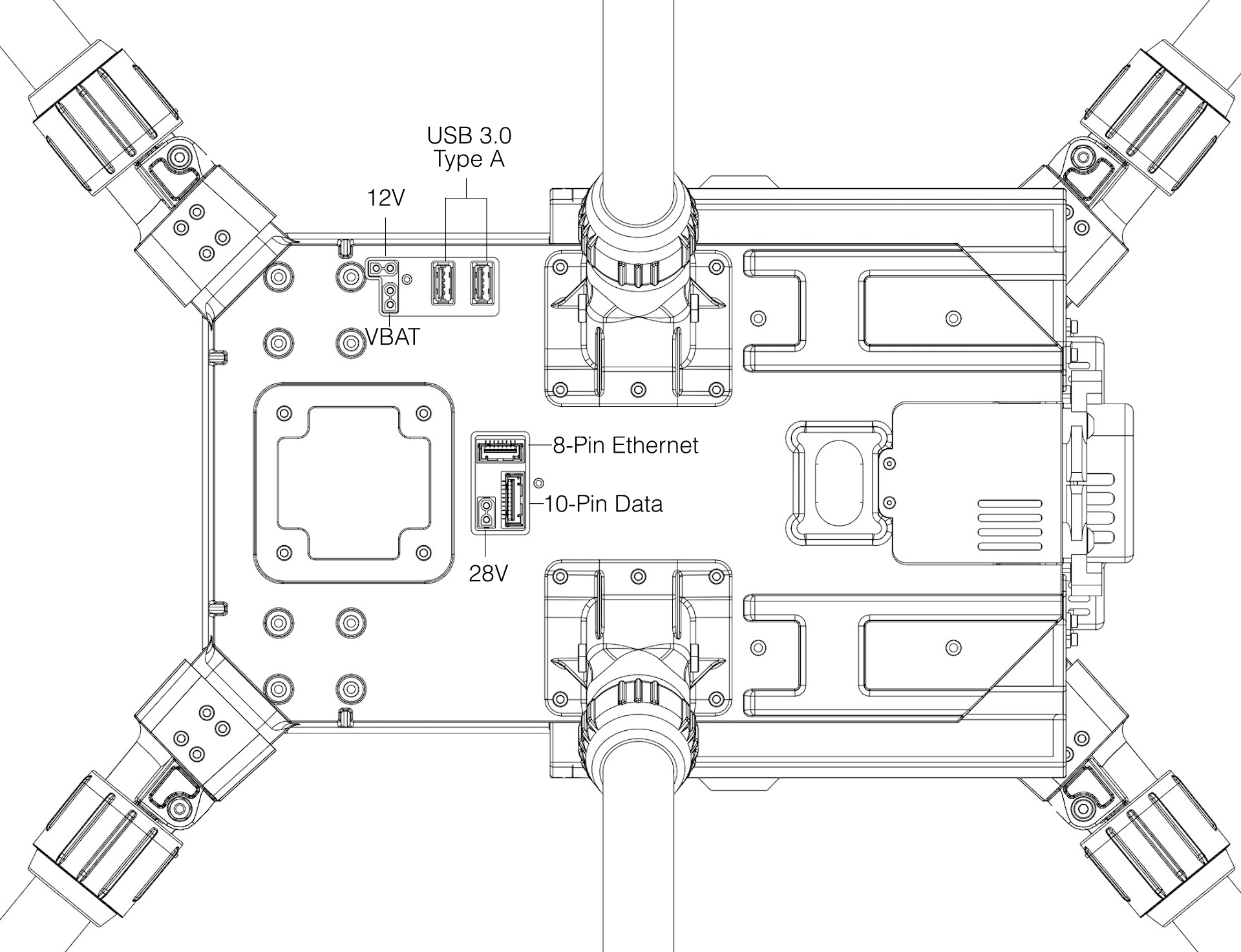 The main I/O access points on the drone are the standard ethernet port located at the top of the drone, two peripheral USB 3.0 (type A) ports, one 10-pin gimbal control port, and one 8-pin ethernet port on the bottom of the drone.